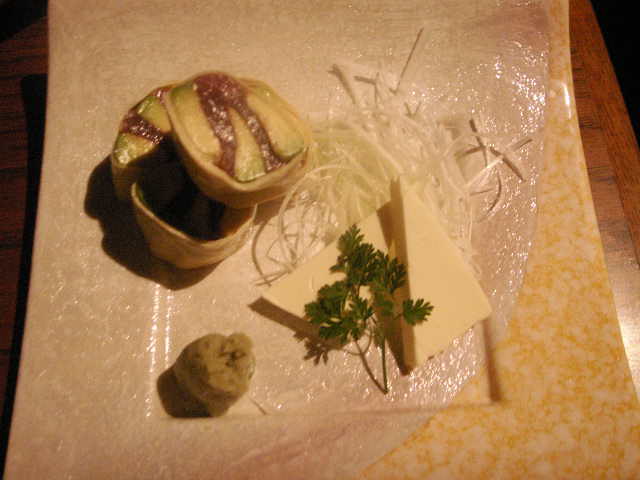 アボカドとマグロの湯葉包み(クリームチーズぞえ) ¥480-