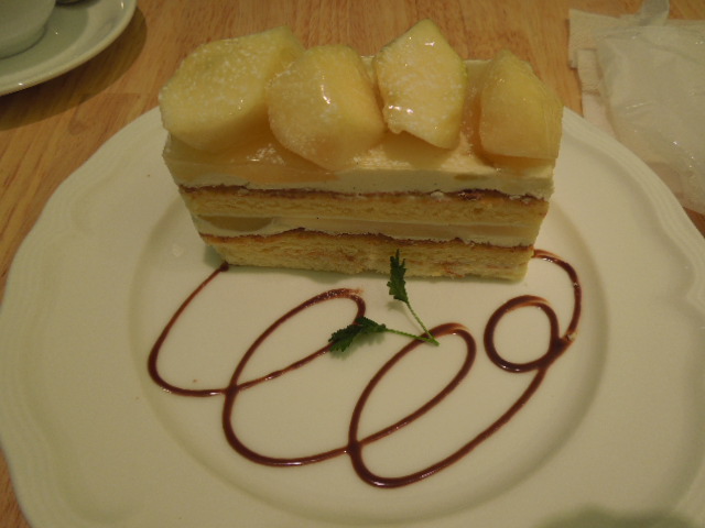 で注文したのがアイスとフルーツの盛り合わせと洋ナシのケーキ。