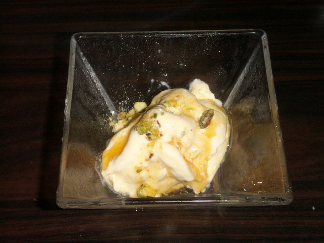 バニラアイスにキャラメルソースと塩の粒がパラパラと。