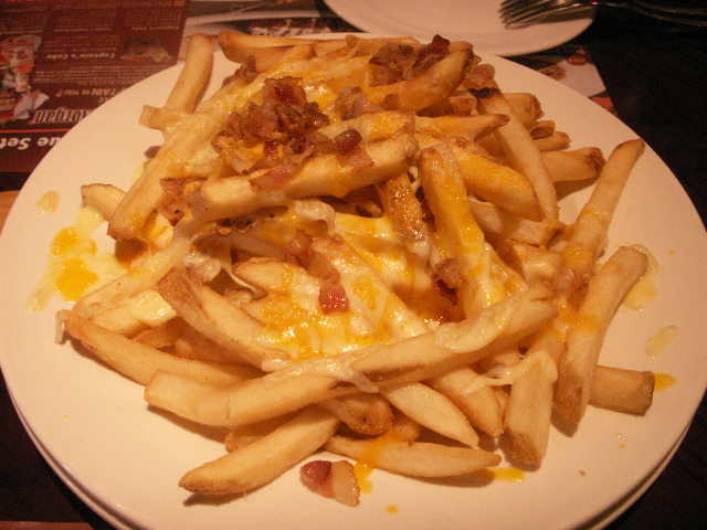フライドポテトの上にカリカリベーコンととろーり2種類のチーズが